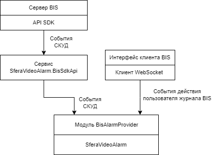 1) Сервис SferaVideoAlarm.BisSdkApi подключается к серверу BIS по API SDK интерфейсу и подписывается на изменение состояний тревожных событий в системе.
