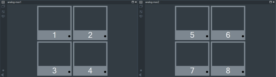 При выдаче команды на переключение камер через сервер BVMS, в отличии от работы через клиентов BVMS, значение поля Granularity из настроек камер не учитывается. В этом случае в приложении BVMS operator client необходимо заранее настроить кадрирование пространства для отображения контролируемых камер, отобразив на экране группы аналоговых мониторов (см. рисунок 4.2.1.6.1).