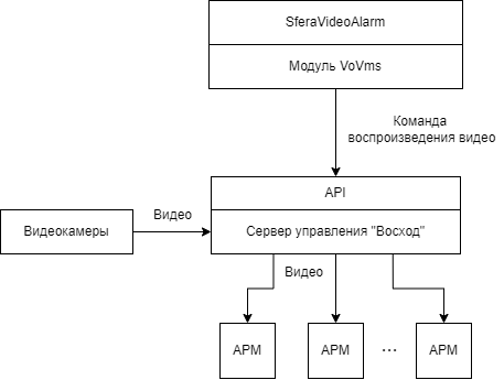 Схема взаимодействия приложения SferaVideoAlarm с ПО "Восход" представлена на рисунке 4.2.2.1.1.