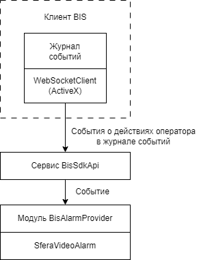 При работе с клиентом BIS оператор АРМ может получать видео с камер наблюдения, которые расположены в том месте, где произошло событие. Для этого в клиент BIS встраивается специальный ActiveX модуль WebSocketClient, после чего в журнале событий появляется индикатор подключения к SferaVideoAlarm, как показано на рисунке 4.1.1.5.1.1.
