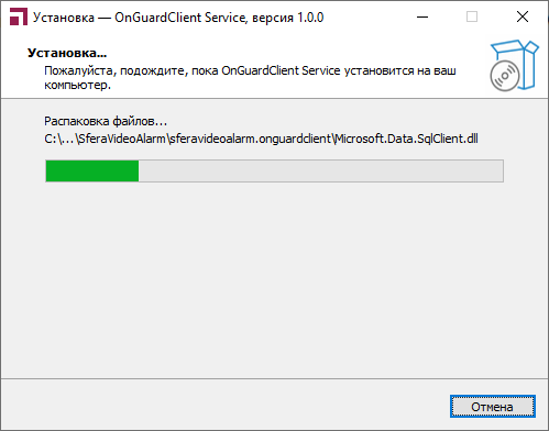 • Нажмите на кнопку "Установить", после чего начнётся копирование файлов интеграционного решения (см. рисунок 4.1.2.3.2). По окончании установки, в Windows будет автоматически добавлена служба SferaVideoAlarm.OnGuardClient
