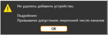 Пользователь может создать ограниченное количество камер согласно лицензии. При достижении максимально доступного согласно лицензии количества камер система автоматически блокирует возможность создания дополнительной камеры и выдает сообщение о превышении допустимого лицензией числа каналов. (см. рис. 3.4.4.1).