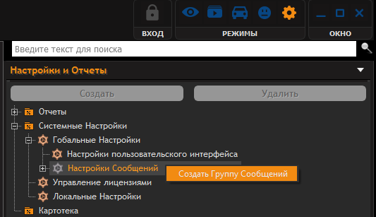 Настройки сообщений позволяют установить необходимые параметры для отображения сообщений в панели событий главного окна оператора, а также отображение всплывающих окон, содержащих стоп-кадр произошедших событий. Параметры применяются к группе сообщений, внутри которой специальные фильтры определяют, какие именно сообщения входят в группу. Для создания новой группы сообщений необходимо нажать правой кнопкой мыши на разделе «Настройки сообщений» (находится в разделе "Глобальные настройки") панели задач и выбрать «Создать группу сообщений» (рис. 6.1.2.1). В окне настроек отобразятся две вкладки «Общие» (см. рис. 6.1.2.2) и «Фильтр» (см. рис. 6.1.2.3).