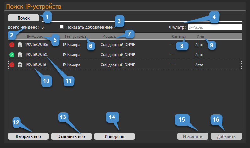 2Параметр "Всего найдено" указывает количество IP-устройств, найденных после выполнения команды "Поиск".