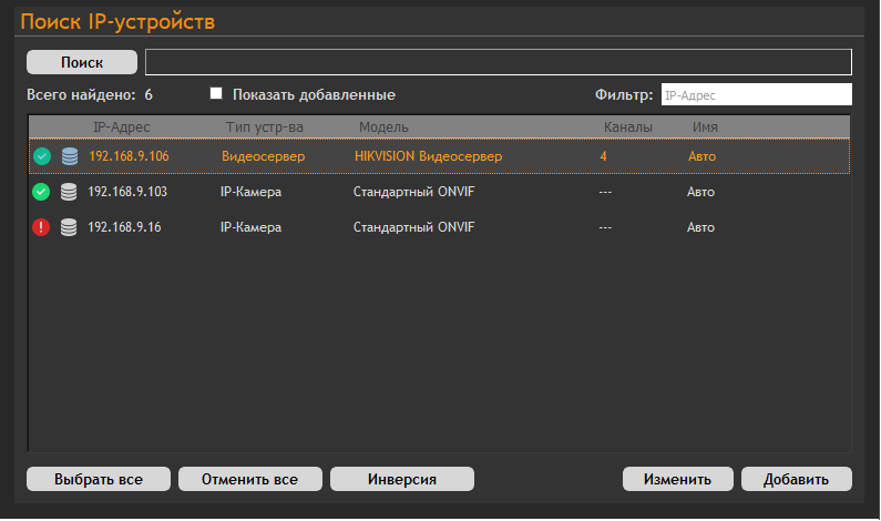3Кнопка "Показать добавленные" позволяет увидеть IP-устройства, уже добавленные в базу данных центрального сервера. В этом случае добавленные устройства будут помечены другим цветом (см. рис. 8.4.2)