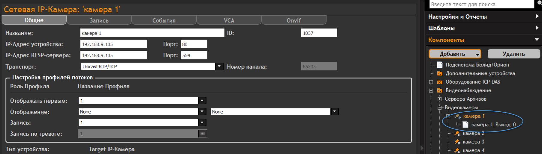- на вкладке «Компоненты» нажмите кнопку «Добавить» и в выпадающем меню выберите элемент «Выход». Данный элемент будет автоматически добавлен в дерево компонентов «Видеонаблюдение» в раздел «Видеокамеры» как дочерний элемент по отношению к элементу "Камера 1" (см. рис. 8.11.1);