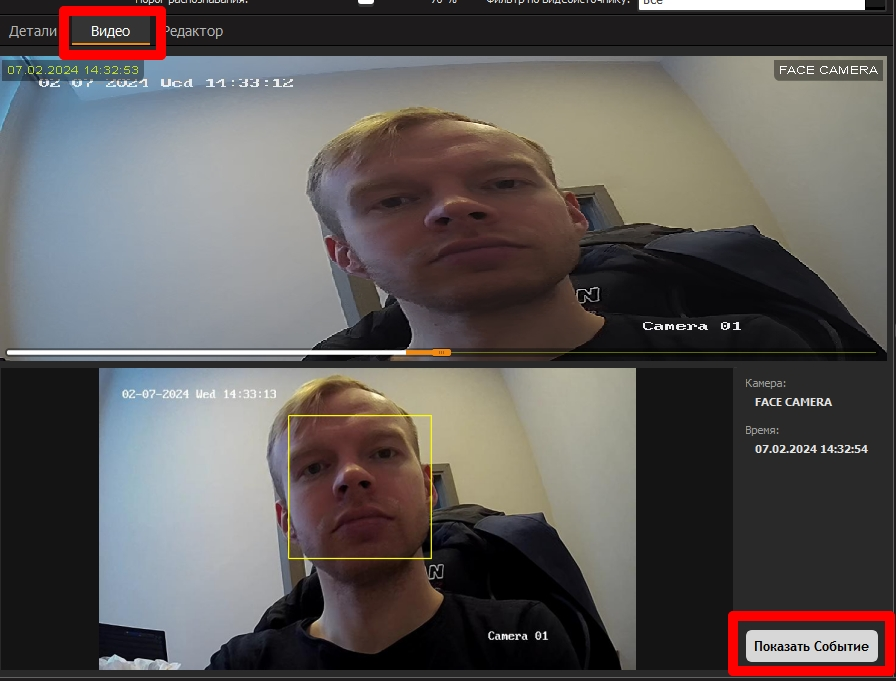 Кнопка "Показать Событие" переводит ползунок видеозаписи в момент обнаружения события.