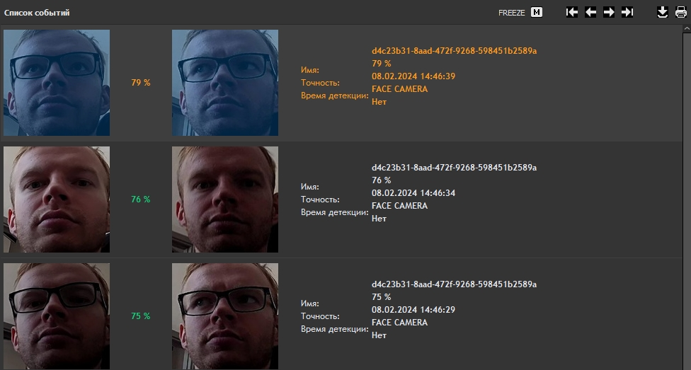 На вкладке "События" отображается список зафиксированных событий в контексте распознания лиц. Алгоритм анализирует обнаруженное лицо со списком сотрудников в базе картотеки.