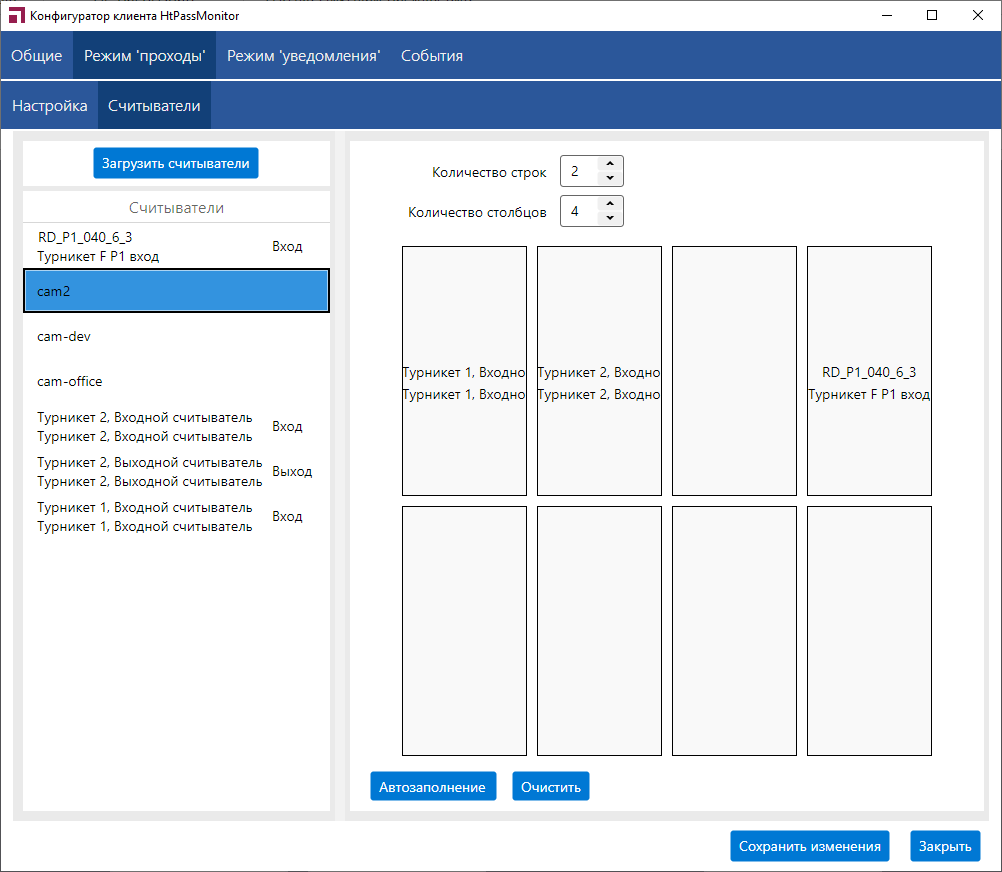 Также, помимо ручного перетаскивания считывателей из списка в ячейки, можно использовать автоматическое заполнение считывателей. Для этого нажмите кнопку "Автозаполнение". Автозаполнение работает по следующему алгоритму: