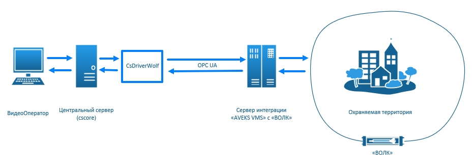 Драйвер CsDriverWold служит связывающим звеном между системами "ВОСХОД" и "ВОЛК". Взаимодействие и обмен данными между драйвером и сервером интеграции (на стороне "ВОЛК") происходит посредством технологий, предоставляющих единый интерфейс для управления объектами автоматизации и технологическими процессами - OPC UA.