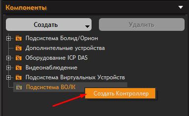 - в разделе Компоненты -> Подсистема ВОЛК кликнуть правой кнопкой мыши на элемент "Подсистема ВОЛК" и выбрать в контекстном меню пункт "Создать Контроллер". В списке устройств "Подсистема ВОЛК" появится новое устройство.