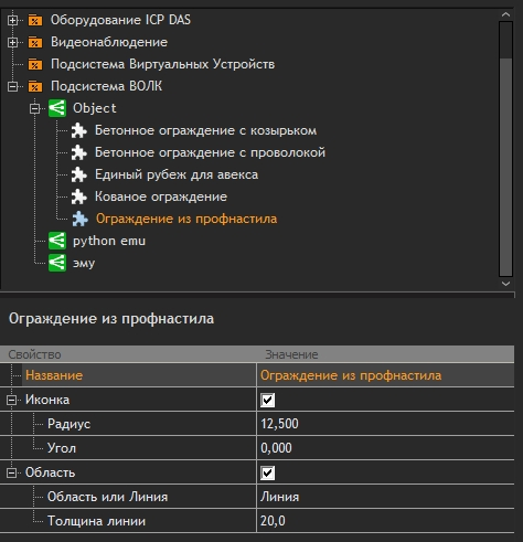 Область - установка флага позволяет переключить отображение элемента на графическом плане в виде области или линии, а также задать его толщину;