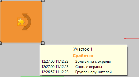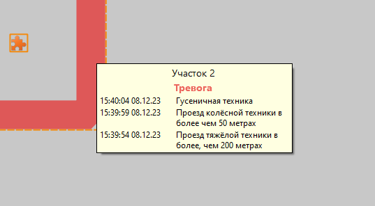 - Если виртуальная линия / зона снята с охраны, но система ВОЛК зарегистрировала тревожное действие, то на графическом плане виртуальная линия / зона, при наведении на неё курсора, отображается со статусом "Сработка" и окрашивается в оранжевый цвет. Уведомления о тревоге в списке событий отображаться не будут.