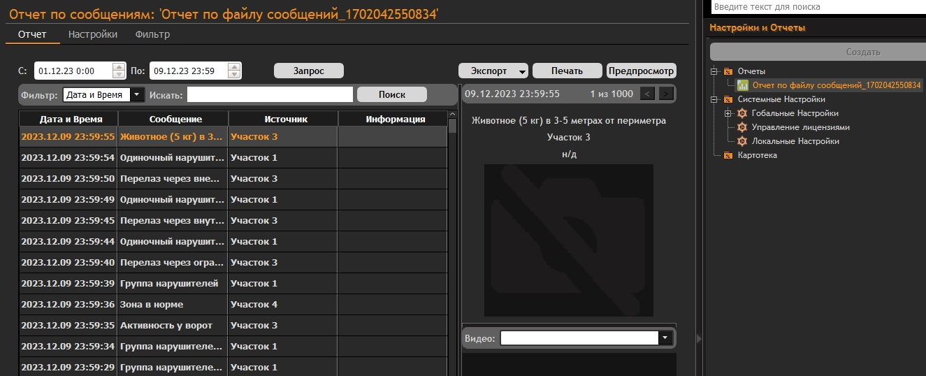 Историю тревог и событий также можно просмотреть в "Отчёты" в разделе "Настройка и Отчёты" в режиме конфигуратора.