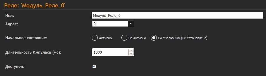 - Длительность Импульса (мс) - позволяет задать продолжительность подачи импульса в миллисекундах при замыкании реле;