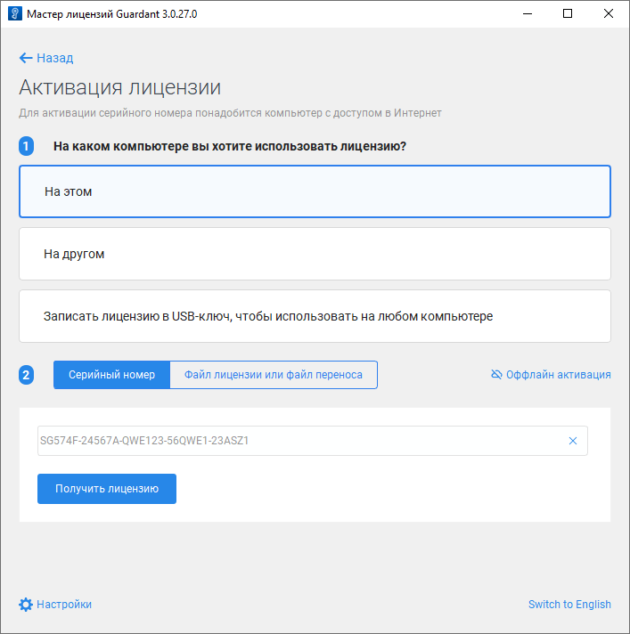 • на компьютере с доступом в интернет также запустите мастер лицензии Guardant