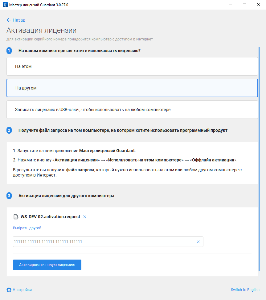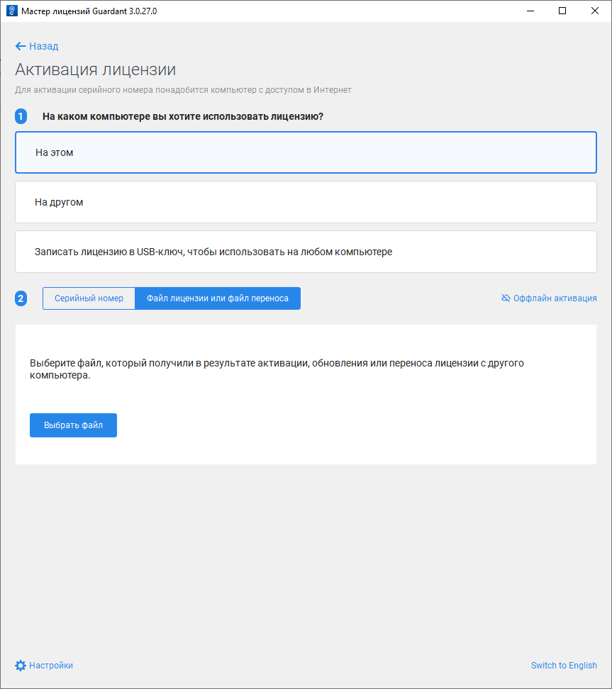 • полученный файл лицензии необходимо перенести на целевой компьютер, где требуется активация лицензии