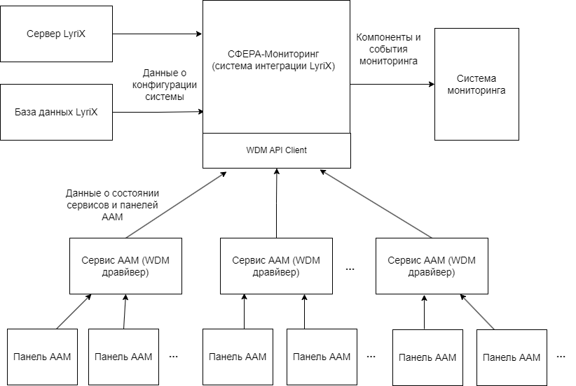 • Приложение СФЕРА-Мониторинг подключается к сервисам ААМ (WDM драйверам) и получает данные состоянии панелей ААМ.