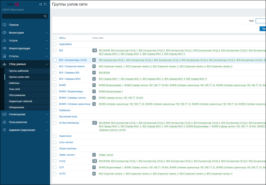 Все добавленные службой СФЕРА-Мониторинг узлы принадлежат одной или нескольким группам. Пример распределения узлов по группам представлен на рисунке 3.3.7.4.2.1.