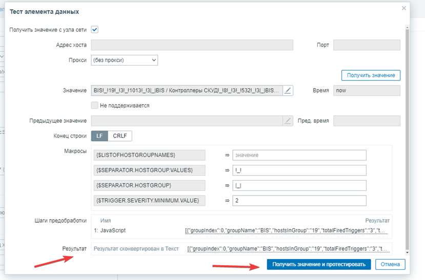 • Для проверки подключения к базе данных, нажать на кнопку “Тест”, после чего откроется окно проверки. В окне теста нажать на кнопку “Получить значение и протестировать”. Если подключение в норме, то появится строка “Результат” с результатом запроса (рисунок 3.3.7.4.2.4).