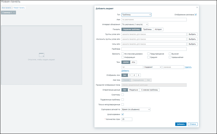 - Настройте виджет. Нажмите кнопку “Добавить”. После изменений панели не забудьте нажать кнопку “Сохранить панель”.
