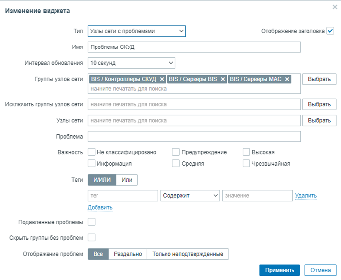 Для данного виджета выберите тип “Узлы сети с проблемами” и в списке “Группы узлов сети” выберите группы, которые необходимо отобразить.