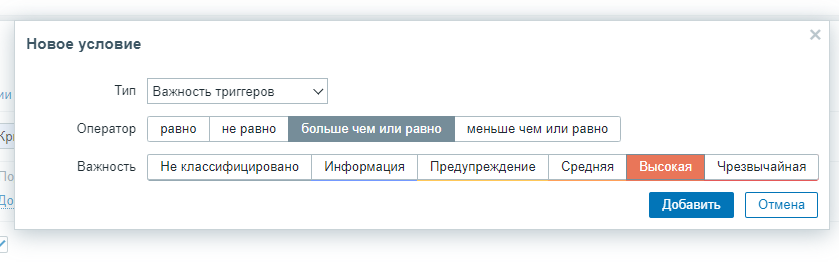- в поле "Условия" нажмите кнопку "Добавить". В окне "Новое условие" выберите тип "Важность триггеров", оператор "больше чем или равно" и важность "Высокая". После этого нажмите кнопку "Добавить".
