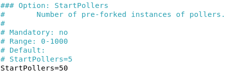 - StartPollers - количество процессов, которые обрабатывают входящие данные. По умолчанию = 5. Рекомендуется увеличить до 30-50.