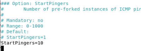 - StartPingers - максимальное количество запущенных процессов для пинга. По умолчанию = 1. Если в системе предполагается большое количество сетевых устройств, то пингеров потребуется больше (обычно речь идёт о видеокамерах и проверке их подключения к сети с помощью пинга). Рекомендуется увеличить значение до 10.