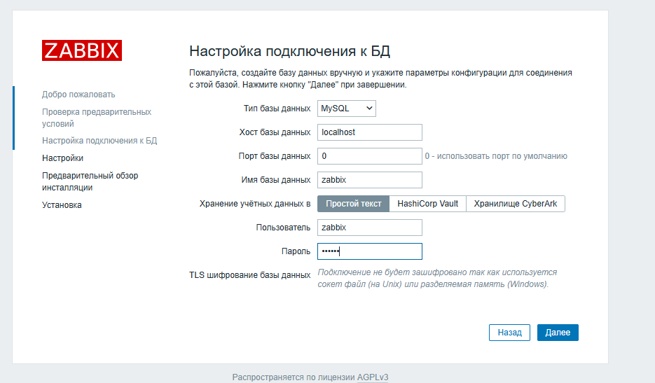 На шаге настройки подключения к базе данных, введите в поле пароль "zabbix".