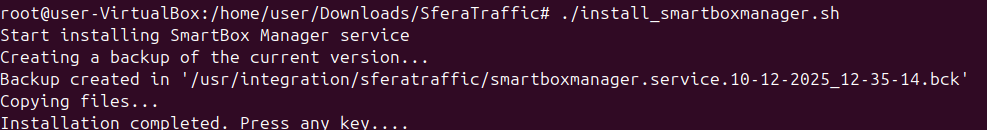 После выполнения установки, файлы интеграционного решения будут скопированы в папку /usr/integration/sferatraffic/smartboxmanager.service. Также в систему добавится сервис smartboxmanager.