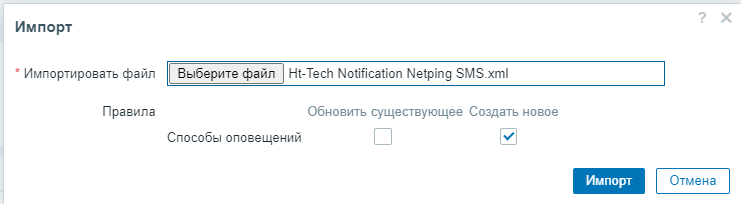 - нажмите на кнопку "Импорт" в верхней части страницы и выберите файл с настройкой оповещения "Ht-Tech Notification Netping SMS.xml" и нажать кнопку "Импорт"