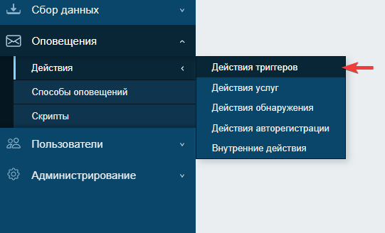 - откройте страницу "Оповещения"→"Действия"→"Действия триггеров"