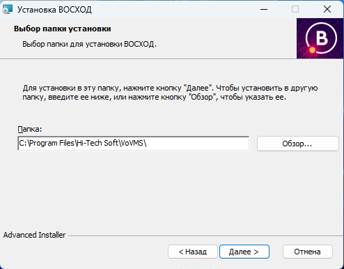Выберите папку для установки. По умолчанию, для установки компонентов «ВОСХОД» предлагается папка «C:\Program Files\Hi-Tech Soft\VoVMS». Если Вы согласны установить компоненты в данную папку, то нажмите кнопку «Далее». Если Вам необходима другая папка, то нажмите кнопку «Обзор…», в появившемся окне выберите необходимую папку, нажмите кнопку «ОК» и кнопку «Далее» для продолжения процесса установки;