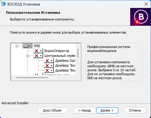 Выберите необходимые компоненты «ВОСХОД» в окне «Выбор компонентов» (см. рис. 3.1.3), согласно варианту схемы размещения компонентов «ВОСХОД». Для этого установите в контекстном меню соответствующих компонентов «Будет установлен на локальный жесткий диск» и нажмите кнопку «Далее». Назначение каждого компонента и варианты размещения компонентов для совместного взаимодействия подробно описаны в разделе 1 Структура системы.