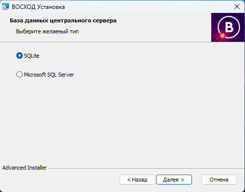 Базу данных центрального сервера можно разместить либо на встроенной в инсталлятор SQLite, либо используя предварительно установленную Microsoft SQL Server (процесс установки описан в пункте 3.1.1.1 Особенности установки «ВОСХОД» с использованием БД Microsoft SQL Server). Оставляем пункт по умолчанию SQLite и нажимаем кнопку «Далее» (см. рис. 3.1.4);