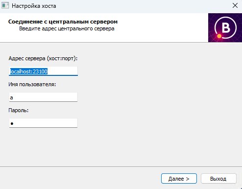 Далее необходимо установить привязку между главным ядром программы и дополнительными компонентами. Разрешаем контролю учетных записей вносить изменения и заполняем окно «Соединение с центральным сервером» (см. рис. 3.1.8). При использовании схемы развертывания «совмещенная», а также во всех случаях, когда для инсталляции на данной машине выбран компонент «центральный сервер», в строке «Адрес сервера» указывается значение: «localhost:23100». Если центральный сервер был установлен ранее (см. схемы Комбинированная и Распределенная), в строке указывается IP-адрес машины, на которой устанавливался центральный сервер. Когда все заполнено, нажимаем кнопку «Далее».