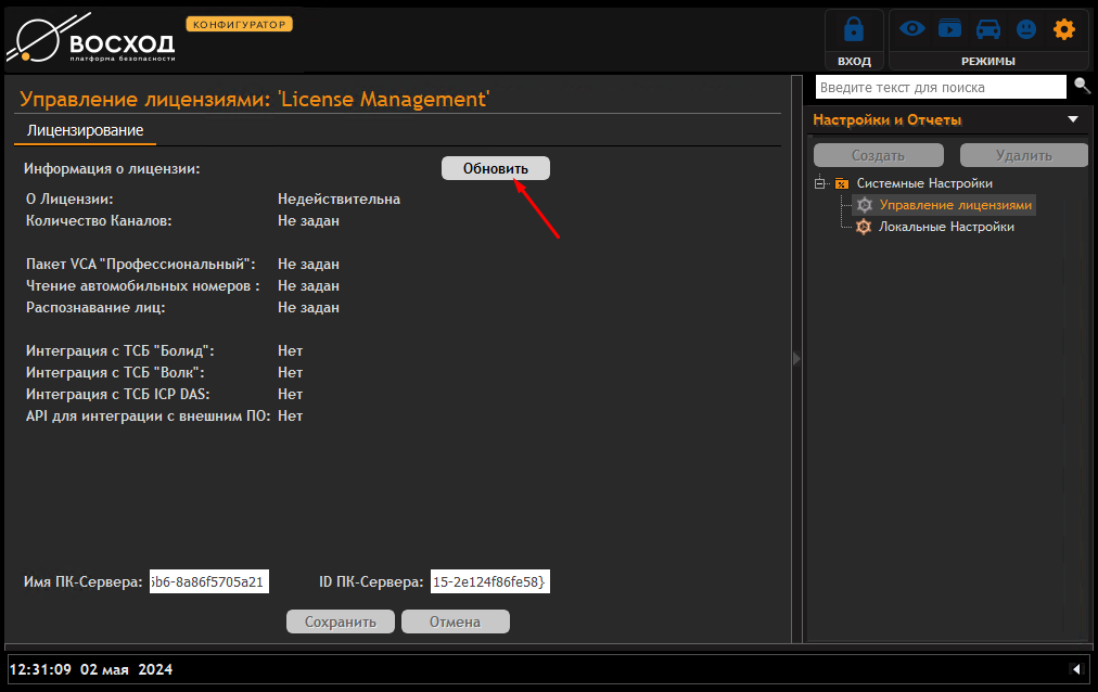 - На вкладке «Лицензирование» нажать кнопку «Обновить» (см. рис. 3.4.2.2). Откроется стандартный диалог выбора файла, в котором надо выбрать INI-файл описания лицензии, пришедший вместе с USB-ключом от поставщика «ВОСХОД»