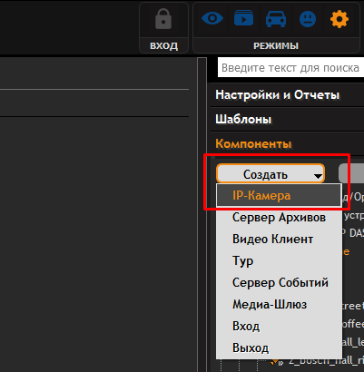 - на вкладке «Компоненты» нажмите кнопку «Создать» и в выпадающем меню выберите элемент «IP-камера»( см. рис. 9.1.3.1). Вы также можете добавить элемент «IP-Камера», нажав на раздел "Видеонаблюдение" правой кнопкой мыши, и в выпадающем меню выбрать команду «Создать IP-камеру