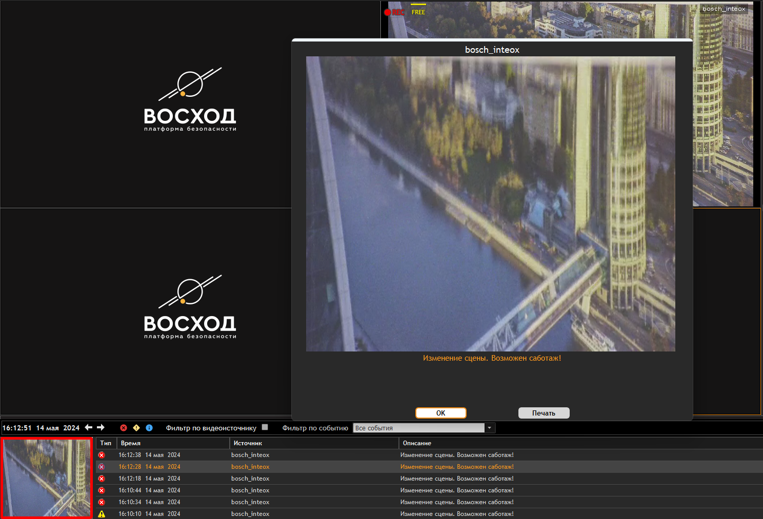 Нажатие курсором по событию выводит в левом нижнем углу миниатюру зафиксированного события. Двойное нажатие по миниатюре открывает новое окно с зафиксированным событием, которое можно вывести на печать, нажав кнопку "Печать".