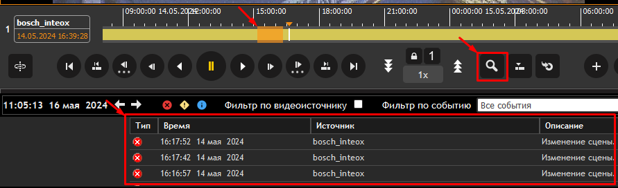Рисунок 13.7.1. Выбор отрезка на временной шкале, кнопка поиска событий и результаты поиска