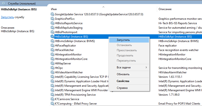 - для каждого экземпляра службы, найдите службу с названием SferaMonitoring.BisSdkApi${название инстанса}, кликните по ней правой кнопкой мыши и выберите команду "Запустить"