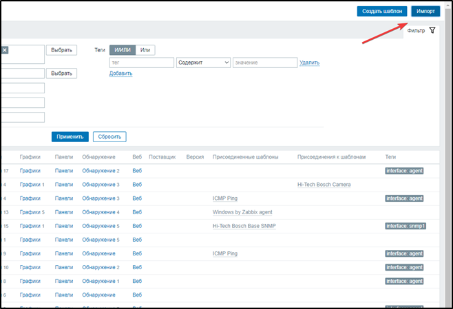 - Появится уведомление о том, что шаблоны успешно импортированы. Можно посмотреть на них, выбрав во вкладке "Сбор данных/Шаблоны" фильтр по группе Templates/Hi-Tech Monitoring <тип системы> (рисунок 3.3.7.3.2.6);