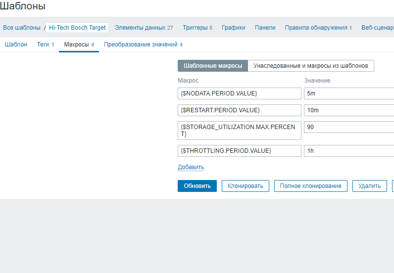 При добавлении сетевого хранилища в систему мониторинга Zabbix, ему автоматически назначается шаблон Hi-Tech Bosch Target. Для настройки параметров мониторинга, перейдите на страницу с шаблонами "Сбор данных"→"Шаблоны" и щёлкните по названию шаблона "Hi-Tech Bosch Target". В окне настройки шаблоны перейдите на вкладку "Макросы".